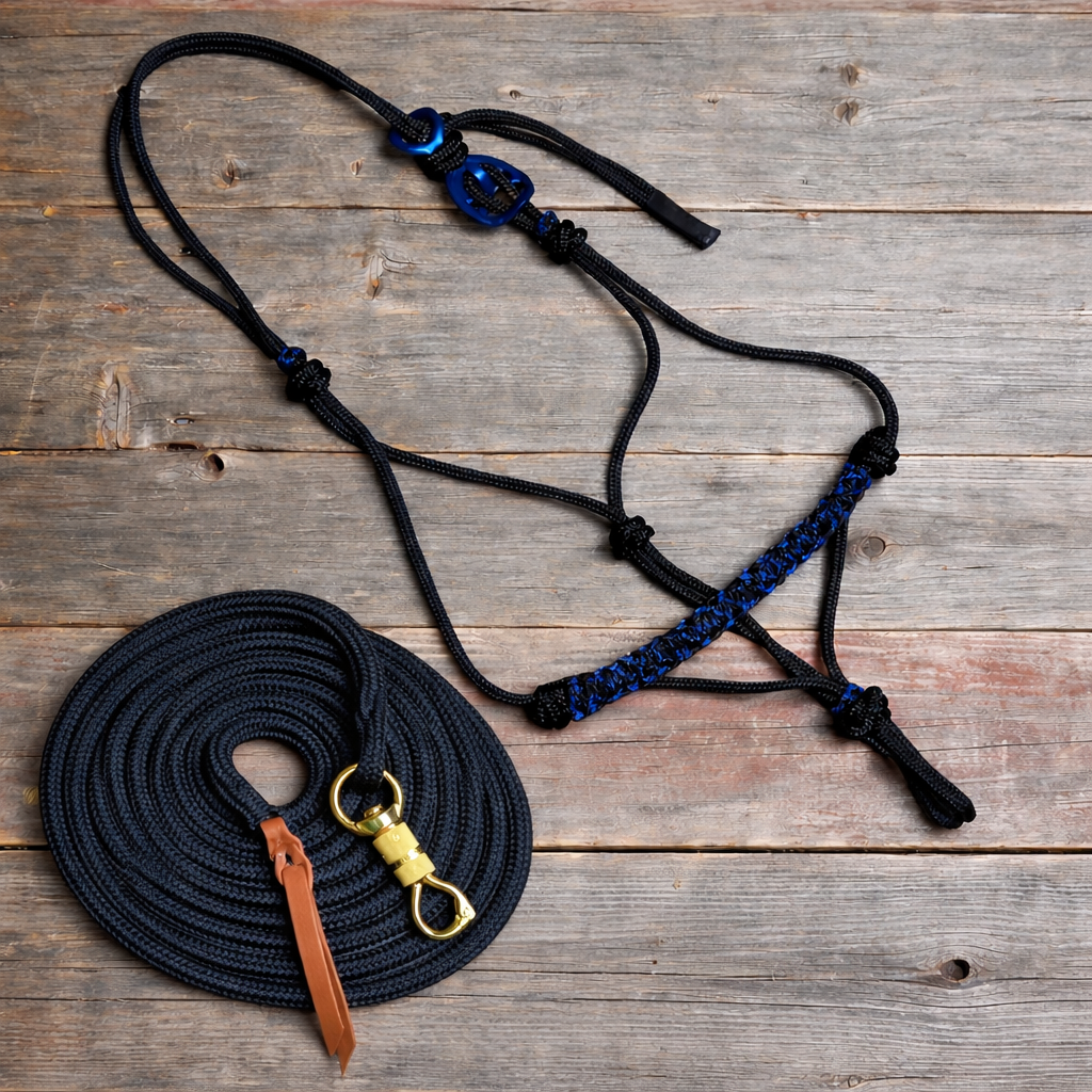 Cet ensemble comprend un licol éthologique fait main et une longe de dressage assortie, conçus pour offrir une communication précise avec votre cheval.